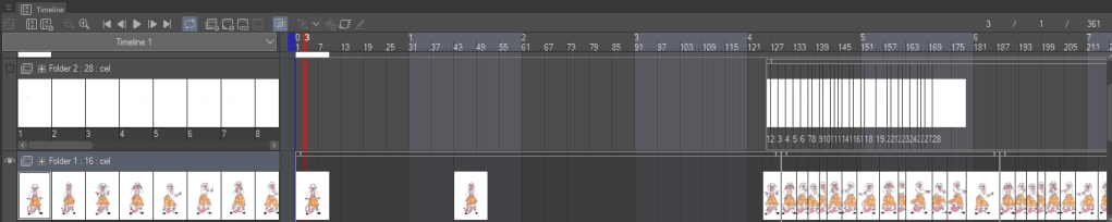 If you can see the timeline, you’ll notice that several frames are repeated, but not the first three frames. This is intentional. I wanted the character to look like she was getting ready before the music picked up. Once the dance started, I only wanted to repeat about 12 frames to conserve some animation effort.